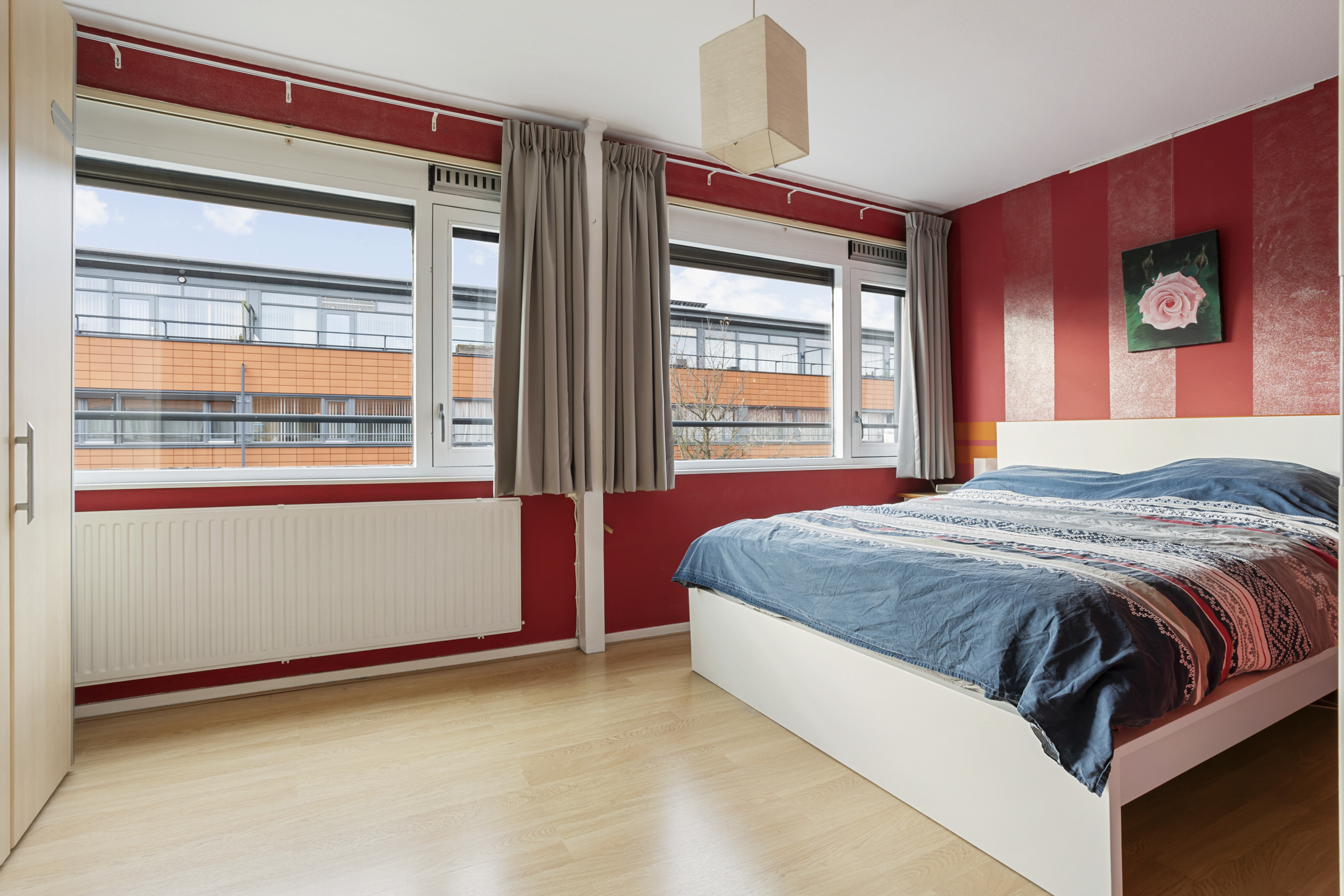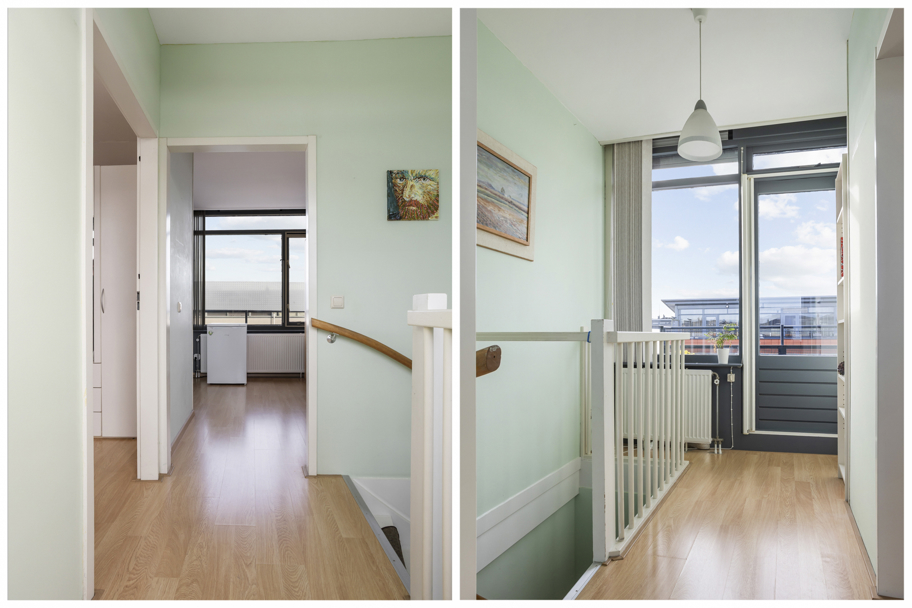 De overloop en 2 slaapkamers hebben een lichte laminaatvloer, de 3e slaapkamer heeft een vloer van Novilon.