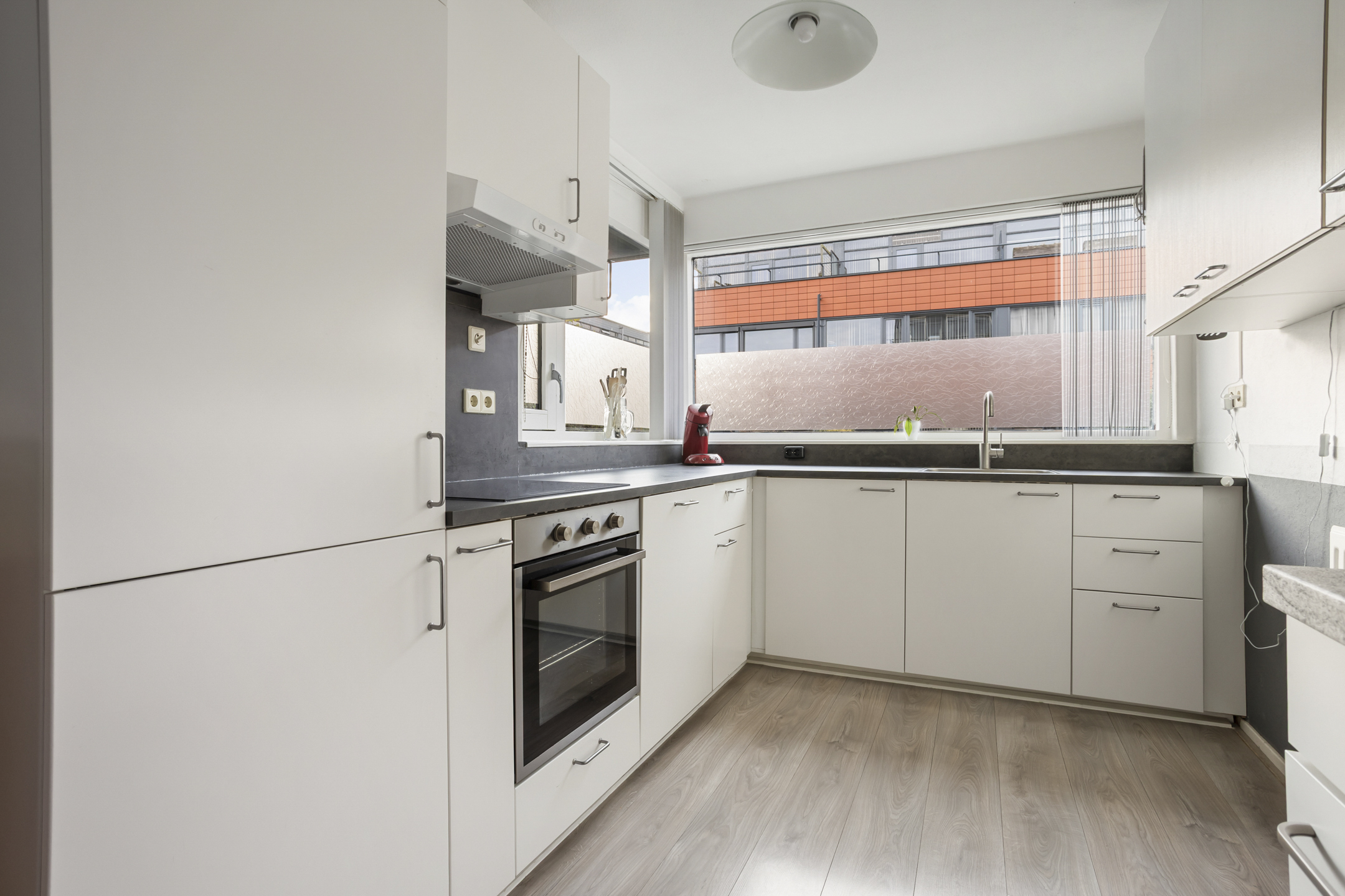 Aan de voorzijde de L-vormige moderne keuken, vernieuwd in 2020, met brede raamkozijnen met uitzicht op de voortuin. De keuken is licht en ruim en is voorzien van diverse inbouwapparatuur zoals koelkast, vriezer, oven, vaatwasser, inductiekookplaat en recirculatiekap.