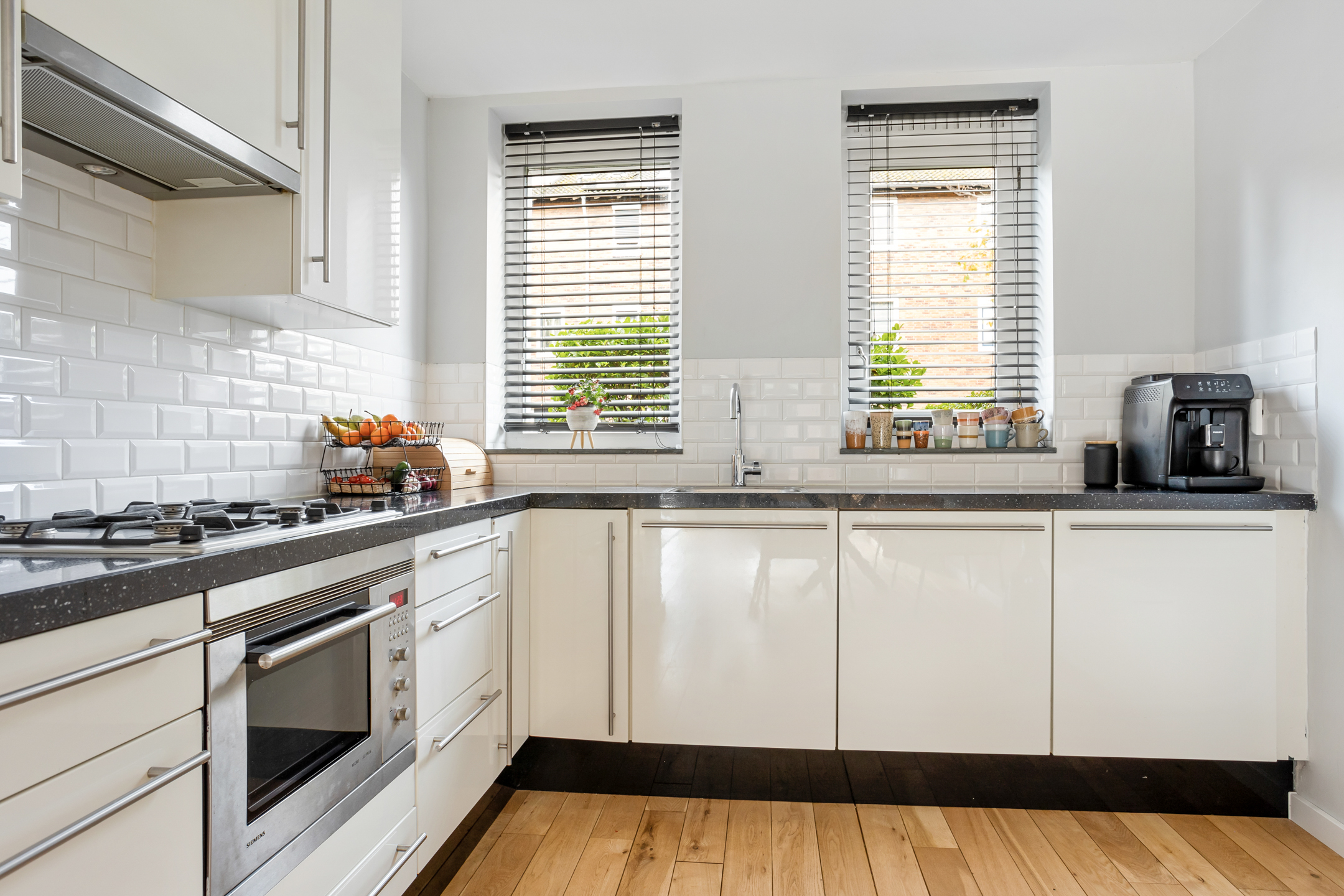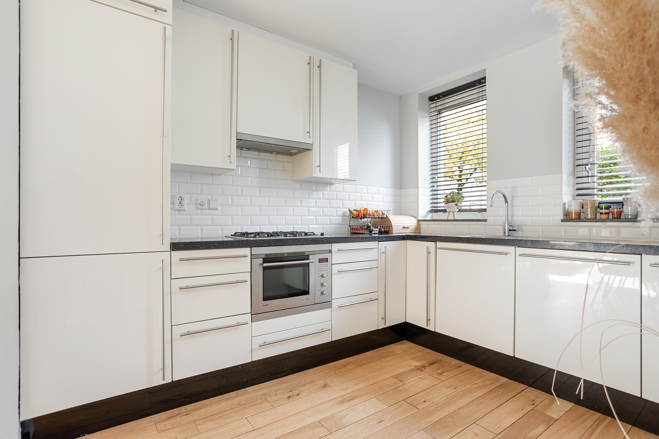 De complete en moderne keuken, aan voorzijde gelegen, is in witte kleurstelling met een granieten blad (antracietgrijs). De keuken is ruim, heeft veel berg- en werkruimte en is voorzien van diverse inbouwapparatuur zoals een koelkast, vriezer, combi-magnetron, vaatwasser, gaskookplaat, afzuigkap en vaatwasser.