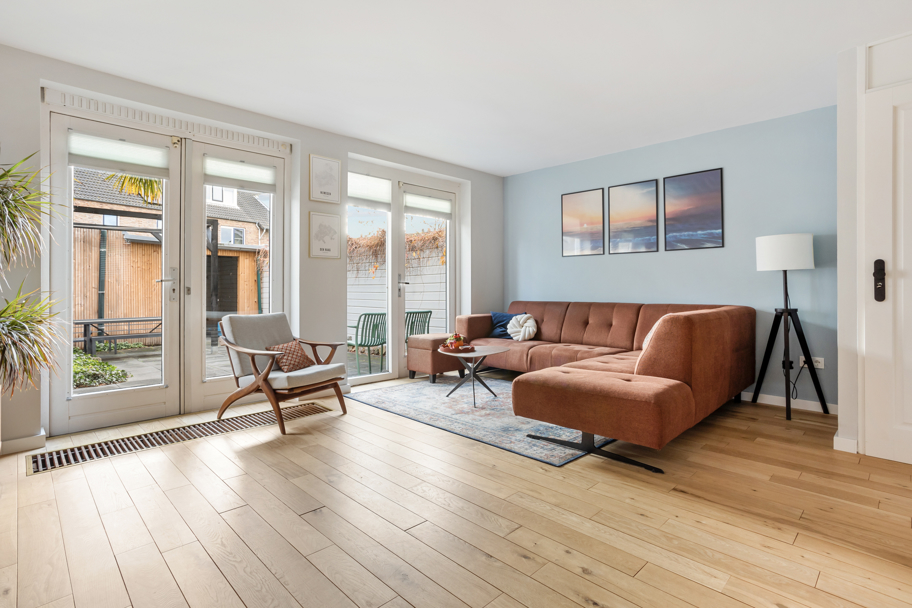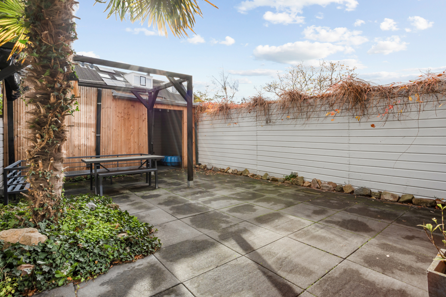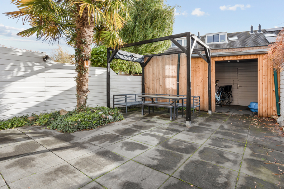 De lichte woonkamer met trapkast heeft grote raampartijen met openslaande deuren en een loopdeur naar de zonnige achtertuin. De tuin is fraai en ruim en heeft aan de achterzijde een entree en een ruime berging met overkapping. Aan de tuinzijde van de berging is een sfeervolle pergola geplaatst om ook daar heerlijk te genieten van het buitenleven.