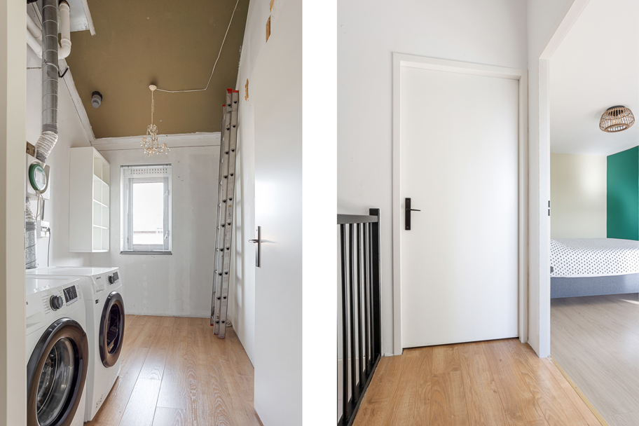 Praktische overloop met een aparte wasruimte met wasmachine- en drogeraansluiting, opstelplaats van CV ketel en van de mechanische ventilatie. Daarnaast bevindt zich hier de 4e zeer ruime L-vormige slaapkamer over de gehele lengte van de woning met verlaagd plafond met spots en een brede dakkapel aan de achterzijde.