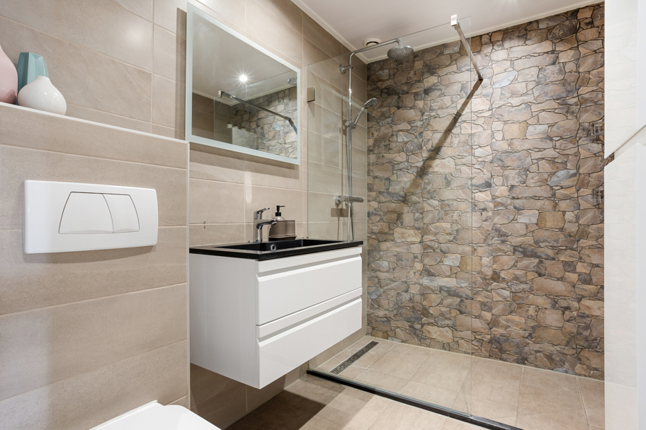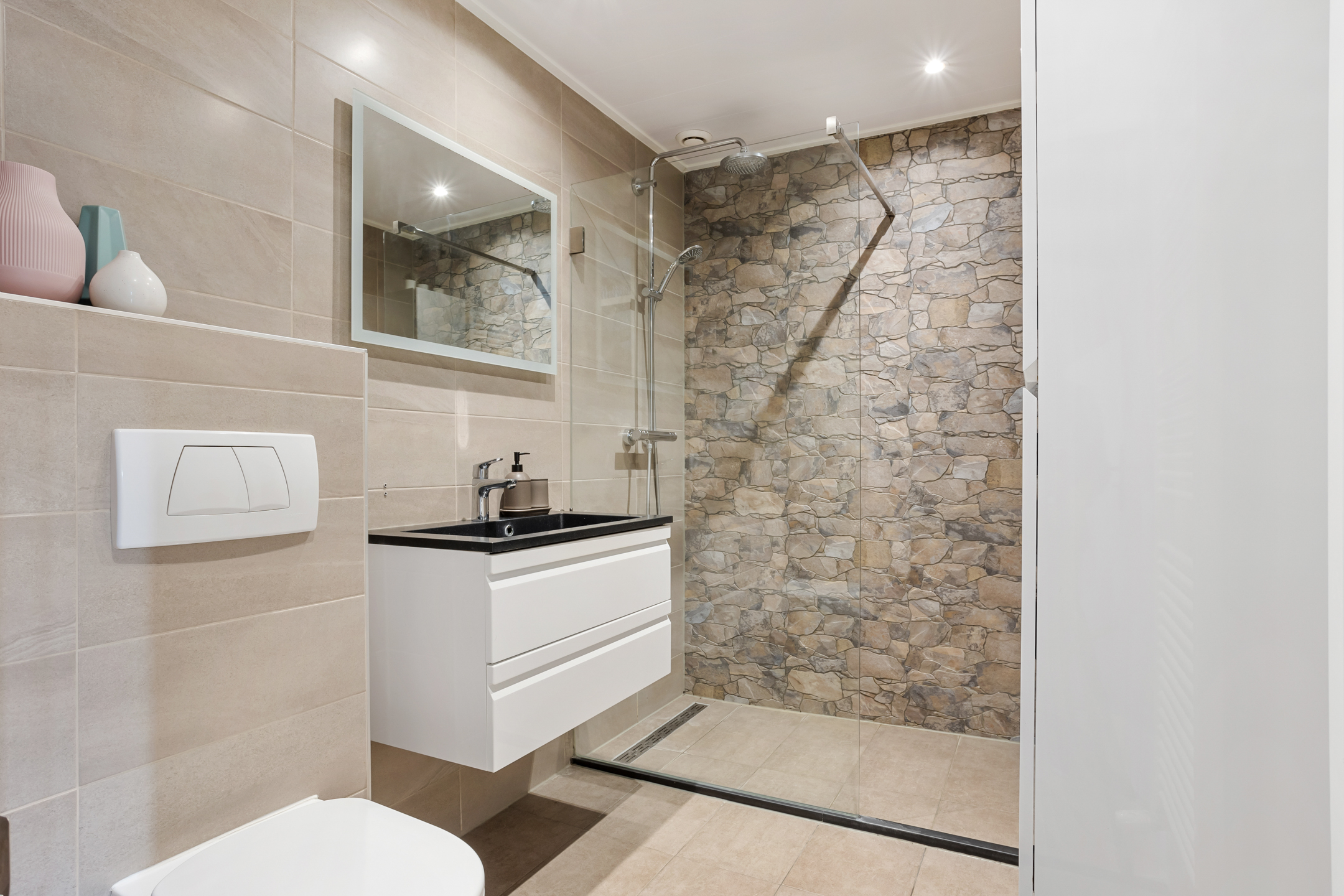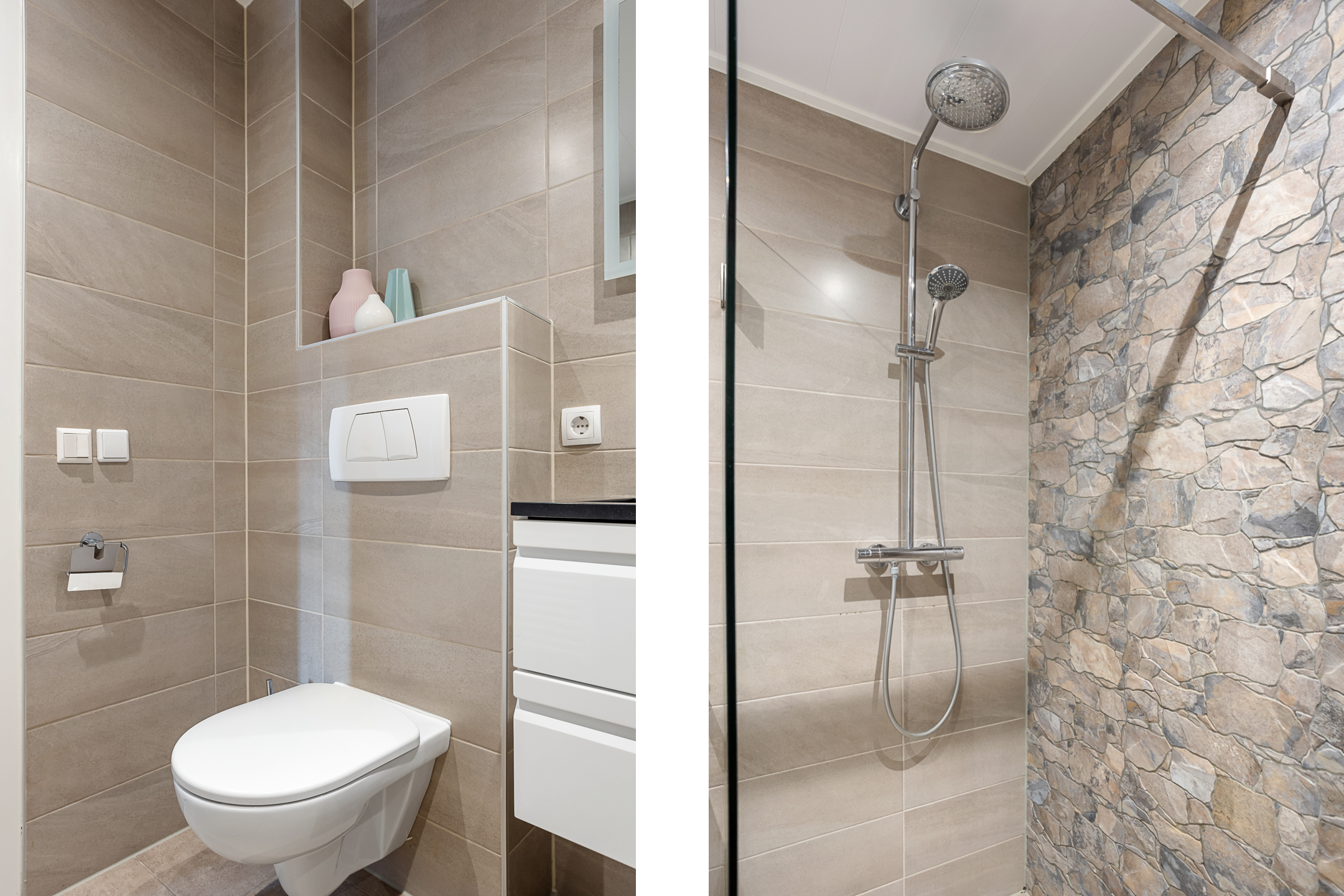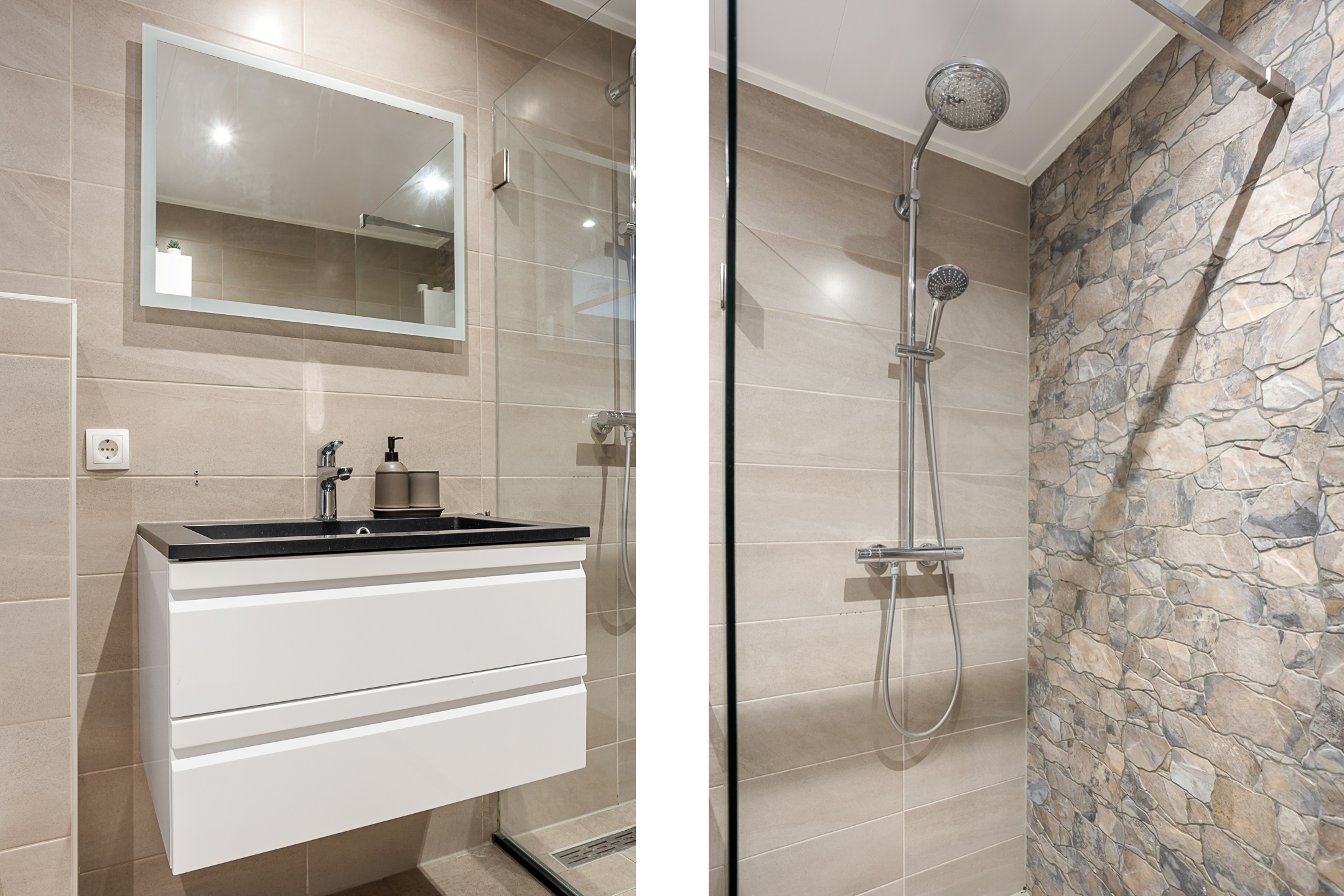 Overloop met toegang tot drie slaapkamers. Alle slaapkamers hebben rolluiken, de 2 aan de achterzijde zijn op zonne-energie. De tussengelegen luxe badkamer is volledig betegeld, heeft een verlaagd plafond met spots en is uitgevoerd met een brede inloopdouche, badkamermeubel met vaste wastafel en lades, een design radiator en een 2e toilet.