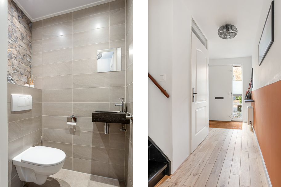 Nette voortuin, entree, hal, modern toilet met zwevend closet en fonteintje en trapopgang naar de eerste verdieping.