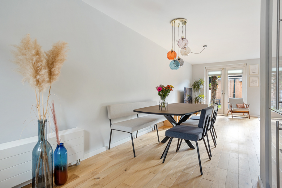 De wanden en het plafond van de woonkamer zijn gestuuct, de deuren op de begane grond zijn fraaie paneeldeuren en de vloer betreft een lichte houten vloer.